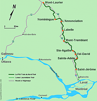 The entire trail runs between Saint-Jérôme and Mont-Laurier for 200 kilometres in roughly a northwest direction. The northern portion of the trail (between Mont-Laurier & Labelle) has a nice paved surface. On this part of the trail, the towns are fewer and further apart, and the surroundings are a little more rustic, and perhaps a touch more scenic.