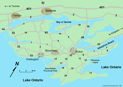 The easiest way to get to Prince Edward County is, of course, to drive there by car. Another possibility is to take the train to Belleville, which is located immediately north of the peninsula. You can bring a bike on some (but not all) VIA passenger trains for an extra $20, and it is possible to get a special protective box at certain stations. The train station in Belleville is located right in town, and only a few kilometres away from the bridge that leads to Prince Edward County. You will have to be prepared to do a bit of climbing to get over the bridge which arches high above the Bay of Quinte (the 2 lane road on the bridge is reasonably wide and has a very narrow paved shoulder).